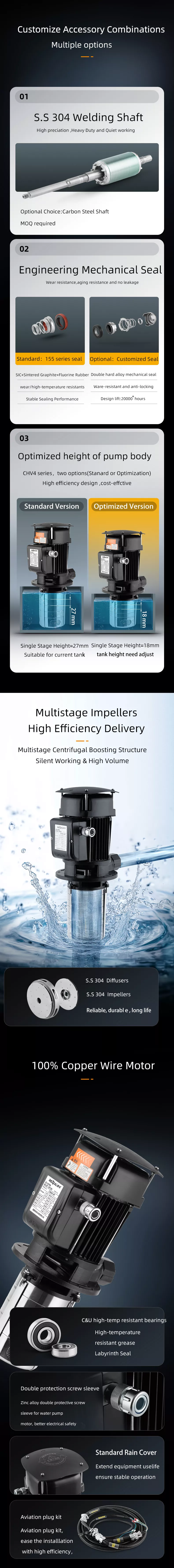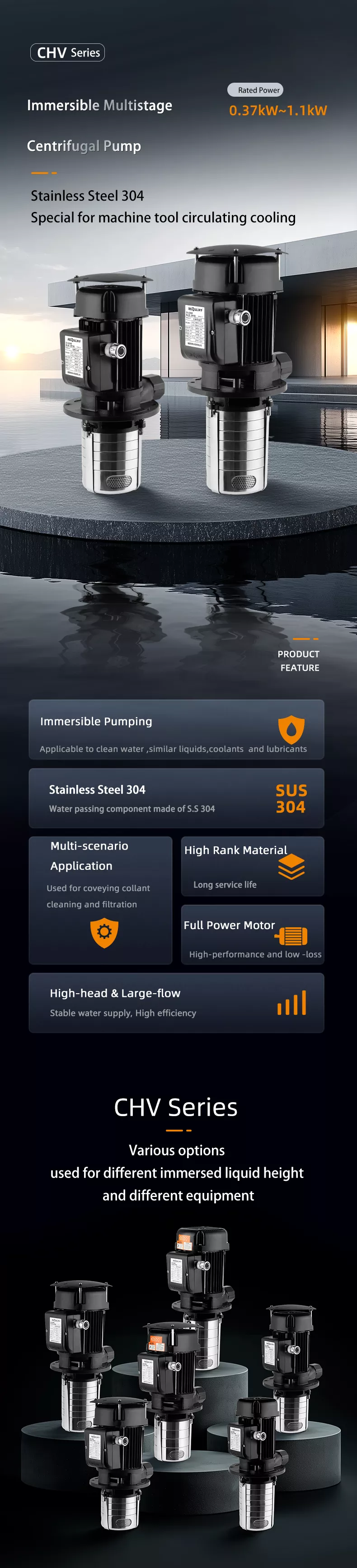 निम्न CHV शृङ्खलाको परिचय हो CHV इमर्सिबल मल्टिस्टेज सेन्ट्रीफ्यूगल पम्प, जसलाई जलमग्न पम्प वा मेशिन टुपम्प पनि भनिन्छ, मेसिन उपकरण कूलेन्ट, स्नेहक, कन्डेन्सेट वाटर ट्रान्सफर, औद्योगिक सफाई उपकरण, फिल्टरेशन प्रणाली र अन्य अनुप्रयोगहरू डुब्ने पम्प प्रयोगका लागि उपयुक्त छ। यो मेशिन औजार, ग्राइन्डिङ मेसिन, सीएनसी मेसिनिङ सेन्टर, ईडीएम मेसिन, औद्योगिक सफाई मेसिन र अन्य उपकरणसँग एकीकरणको लागि उपयुक्त छ।